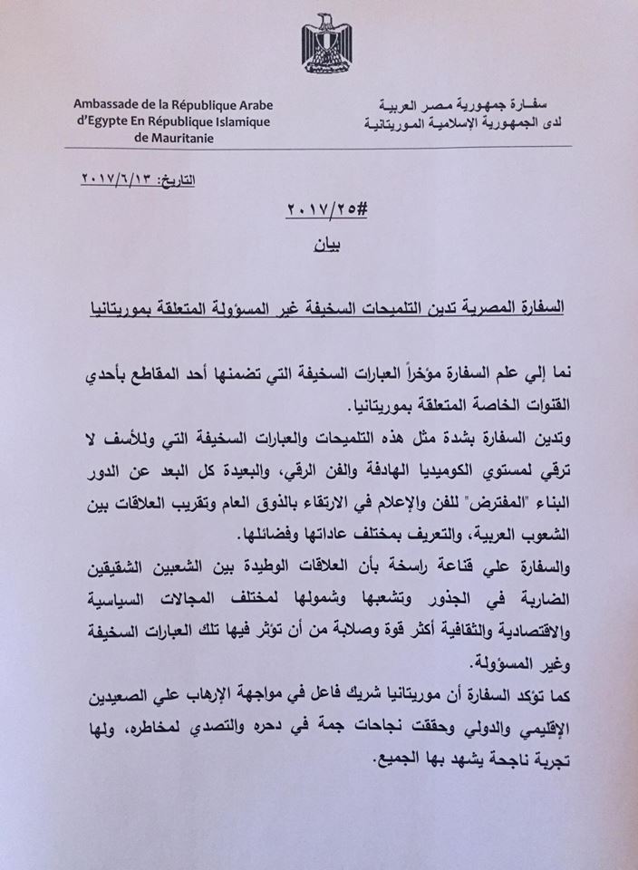 أدانت السفارة المصرية في نواكشوط ما وصفته "بالعبارات السخيفة التي تضمنها أحد المقاطع بإحدى القنوات الخاصة المصرية المتلعقة بموريتانيا" >