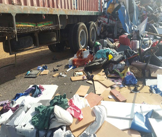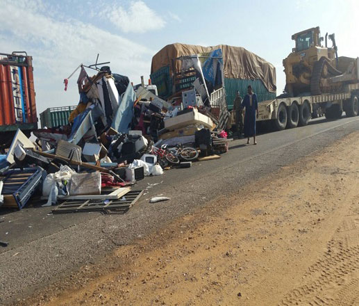 وغطت البضائع المبعثرة من الشاحنات الشارع وجوانبه مما يوضح جسامة الحادث.