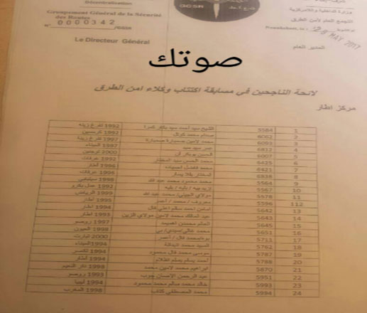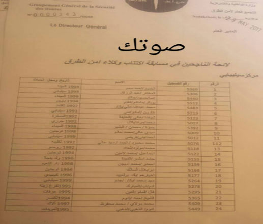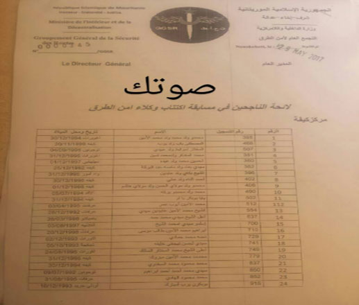 أصدر التجمع العام لأمن الطرق في موريتانيا مساء اليوم الاثنين 29 مايو 2017 نتائج مسابقة اكتتاب وكلاء القطاع التي اجريت في الأشهر الماضية بولايات الحوض الشرقي والعصابة وآدرار وكيديماغا.