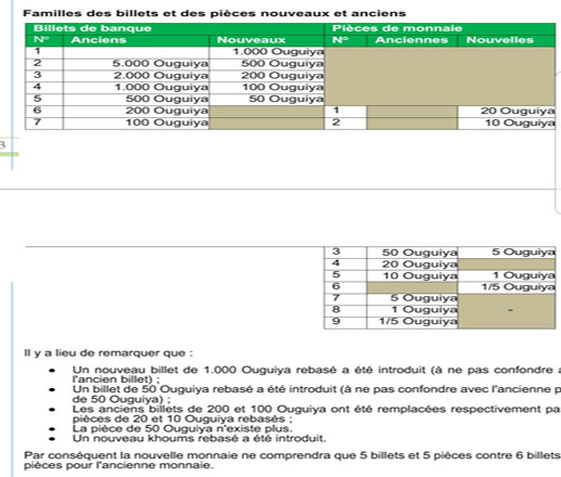 وأصدر البنك المركزي الموريتاني وثيقة بين فيها التغيرات التي ستطرأ على العملة المعروفة منها؛: