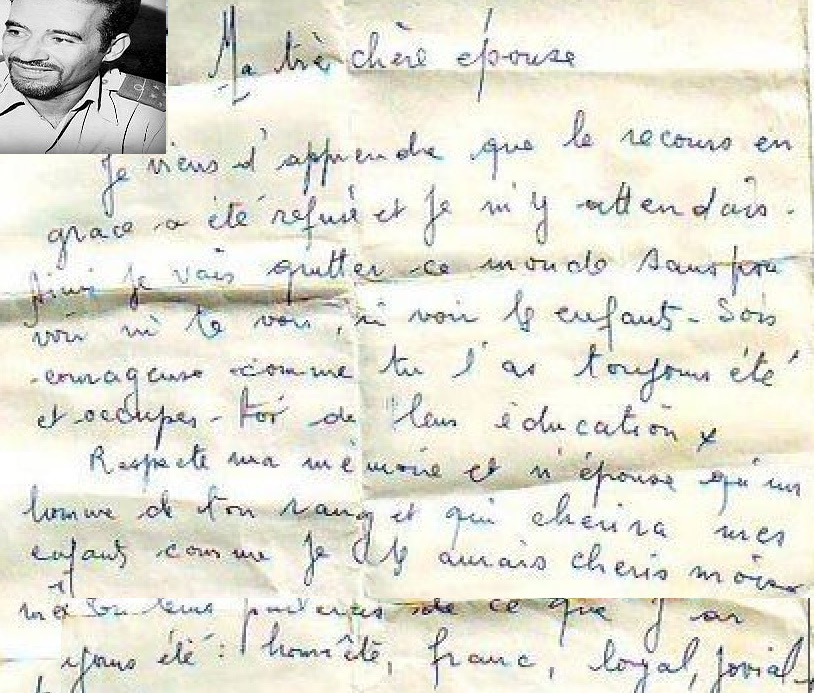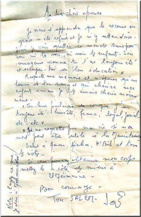 و قبل تنفيذ حكم الاعدام على المغفور له أحمد سالم ولد سيدي كتب رسالة بخط يده إلى زوجته مانه بنت لحبيب تترجم ما تمتع به من شجاعة وإيمان :