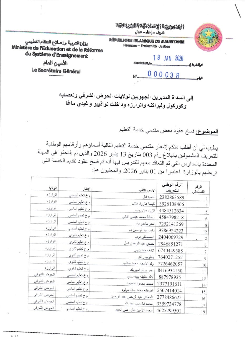وحسب البلاغ، يتوزع مقدمو الخدمات الذين شملهم القرار على سبع ولايات هي: الحوض الشرقي، العصابة، كوركل، البراكنة، الترارزة، داخلت نواذيبو، وكيدي ماغا.
