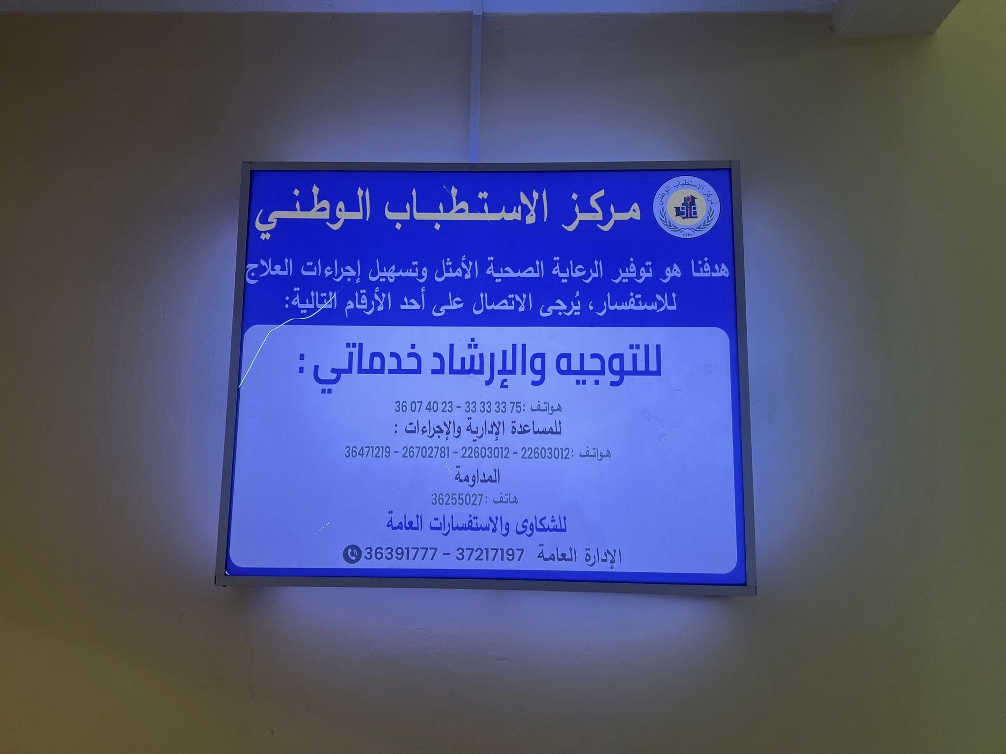 باشرت الإدارة العامة لـ مركز الاستطباب الوطني تثبيت لوحات إرشادية كبيرة ومضيئة داخل مختلف مرافق المركز، تتضمن أرقام هواتف عدد من المسؤولين والمشرفين، وذلك في خطوة تهدف إلى تسهيل ولوج المواطنين إلى الخدمات الصحية وتعزيز قنوات التواصل المباشر مع الإدارة.